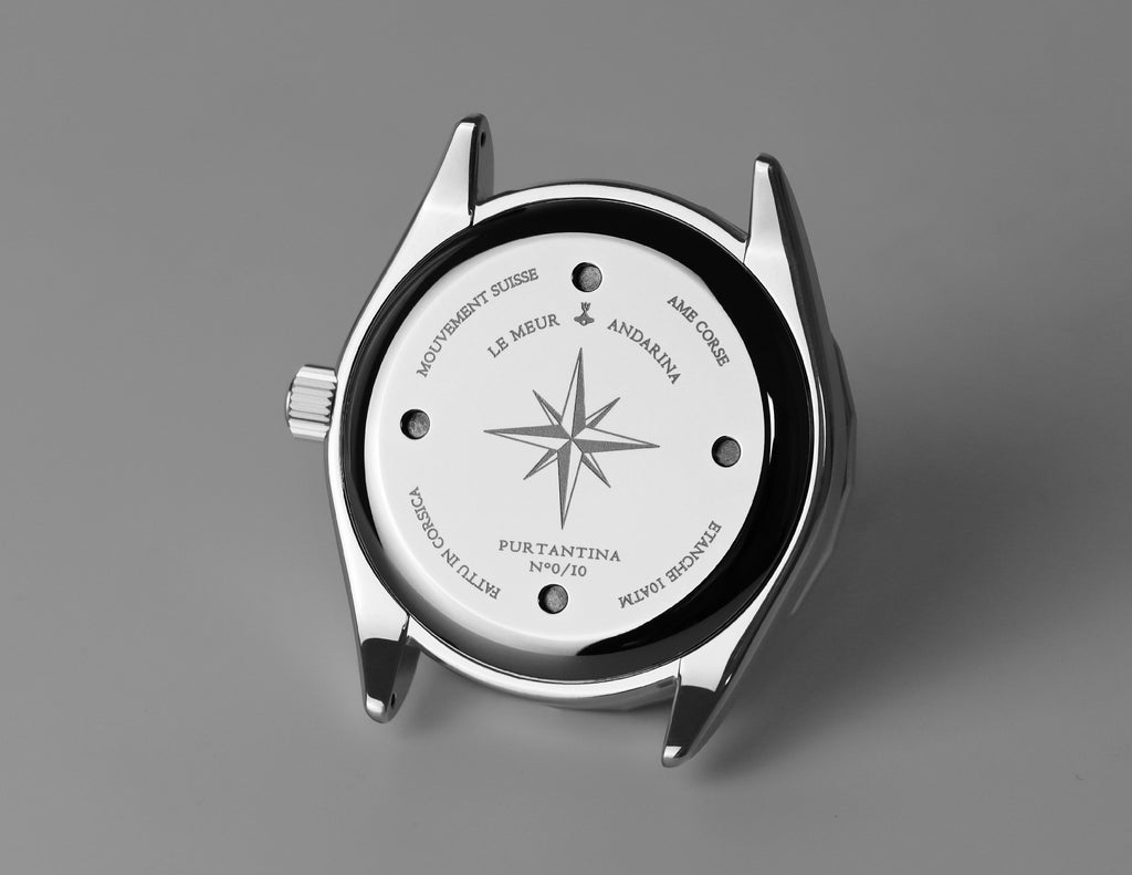 Baptisée "Purtantina" ("Petite boussole" en langue corse), cette édition limitée à 10 exemplaires du modèle Andarina présente un cadran en micro-marqueterie réalisé par mes soins à l'atelier de Solenzara (Corse).