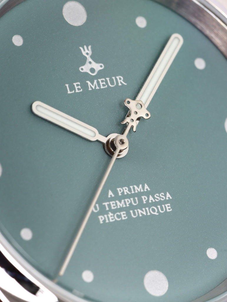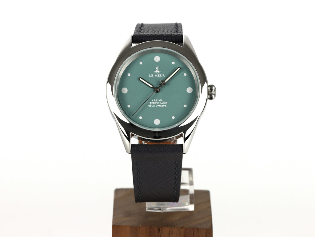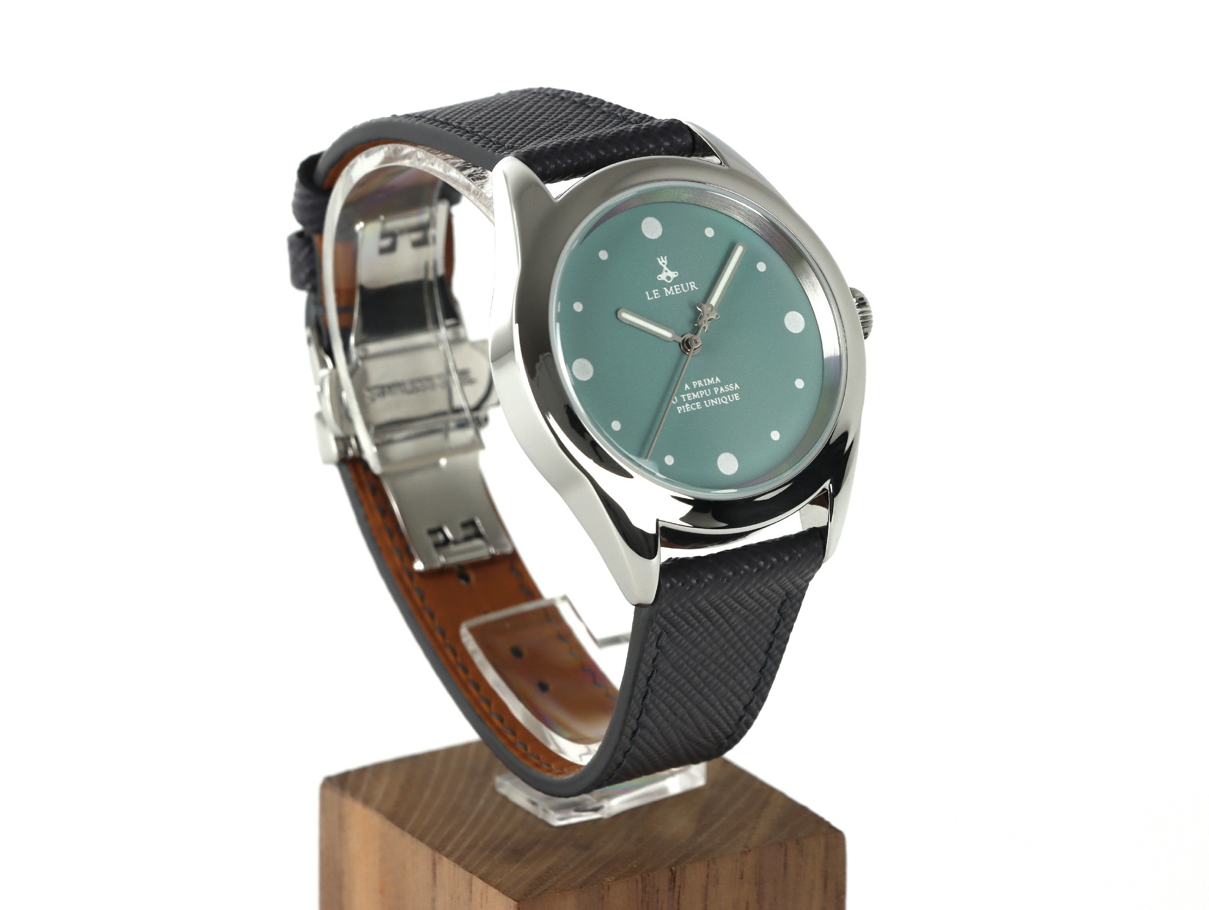 Sous son verre saphir à haute résistance aux rayures est abrité le cadran, également réalisé dans l'atelier Le Meur. Un mouvement Suisse anime ce garde temps et lui confère robustesse et fiabilité.